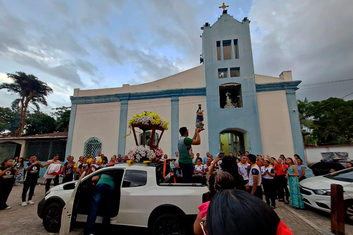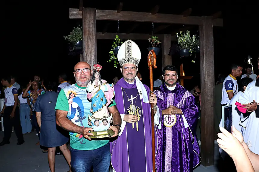A Prefeita de Benevides, Luziane Solon, teve a honra de carregar a imagem até o altar montado na entrada da sede do Poder Executivo, em uma cerimônia marcada por momentos intensos de oração e gratidão.