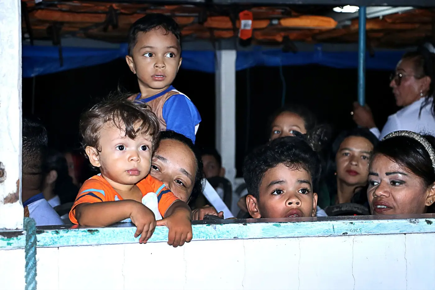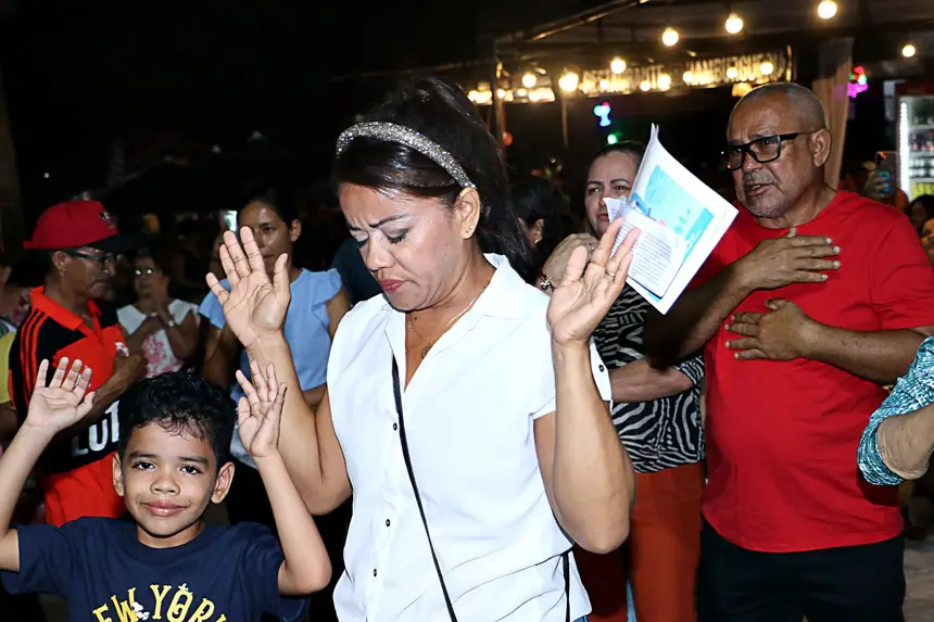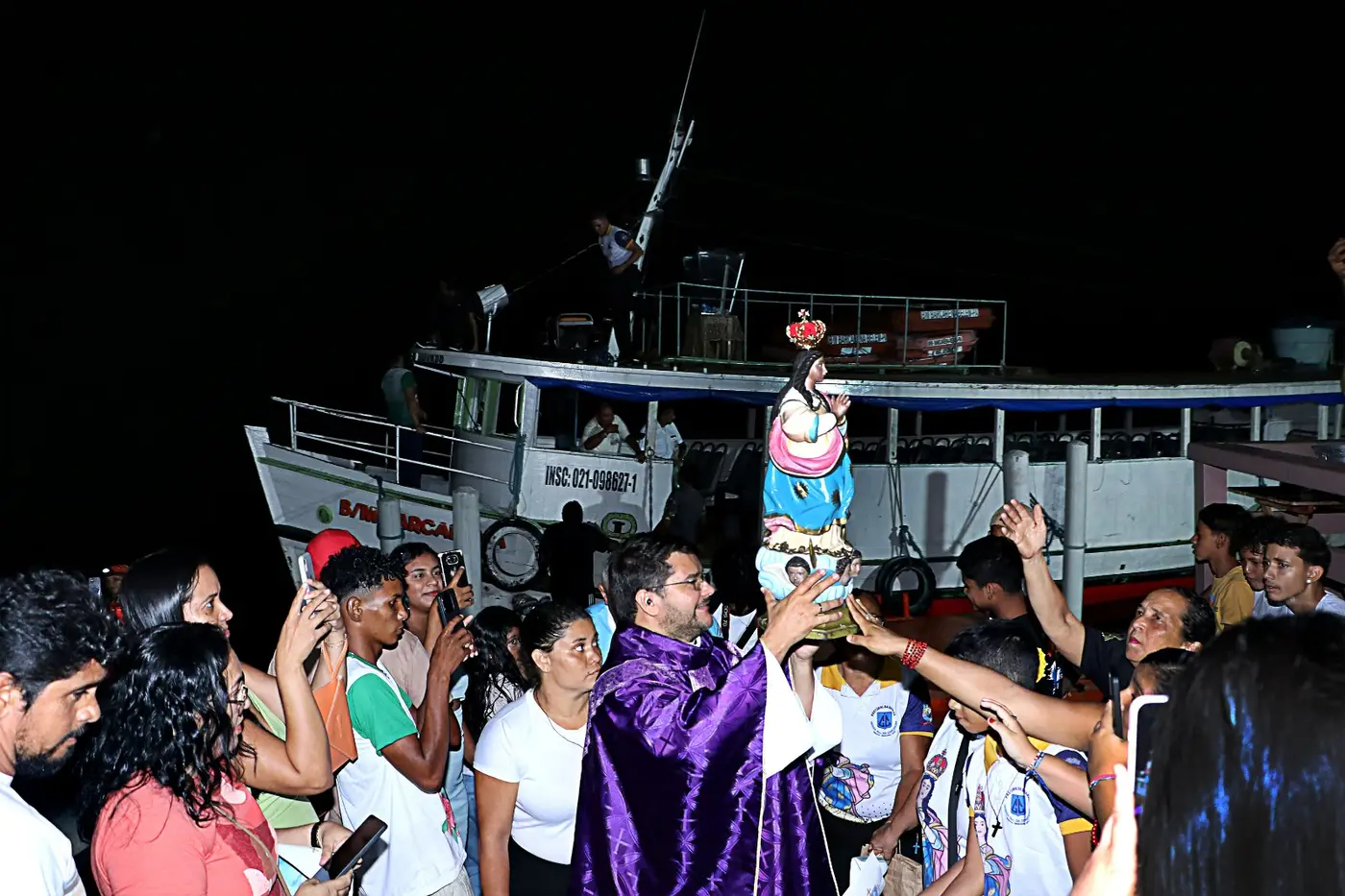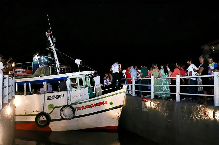 Ainda sob a luz da Lua, fiéis erguiam as mãos em oração e agradecimento, aguardando o desembarque da padroeira no trapiche da orla.