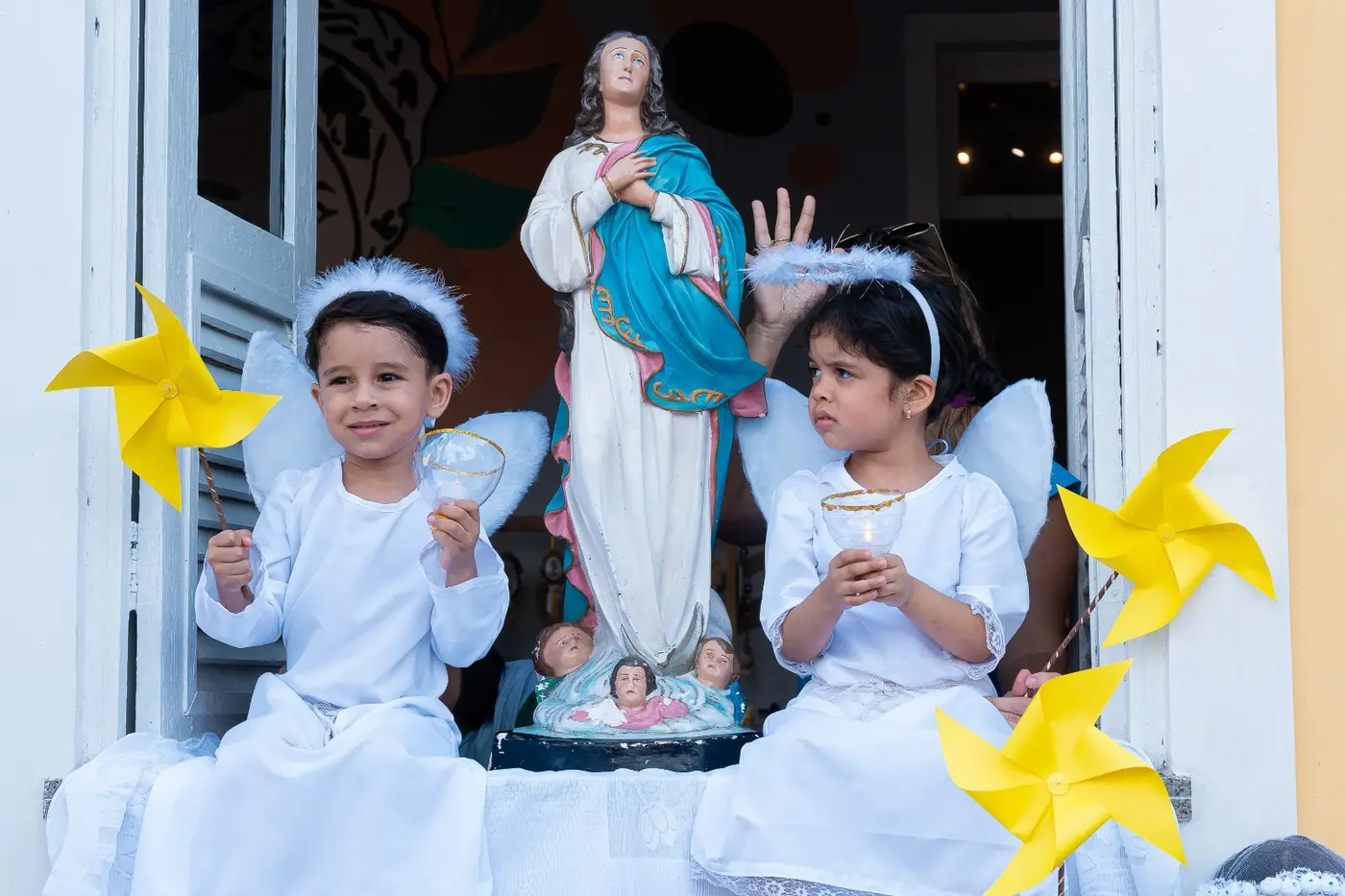 O cortejo foi enriquecido com a presença de crianças vestidas de anjos, simbolizando a pureza e a proteção da padroeira.