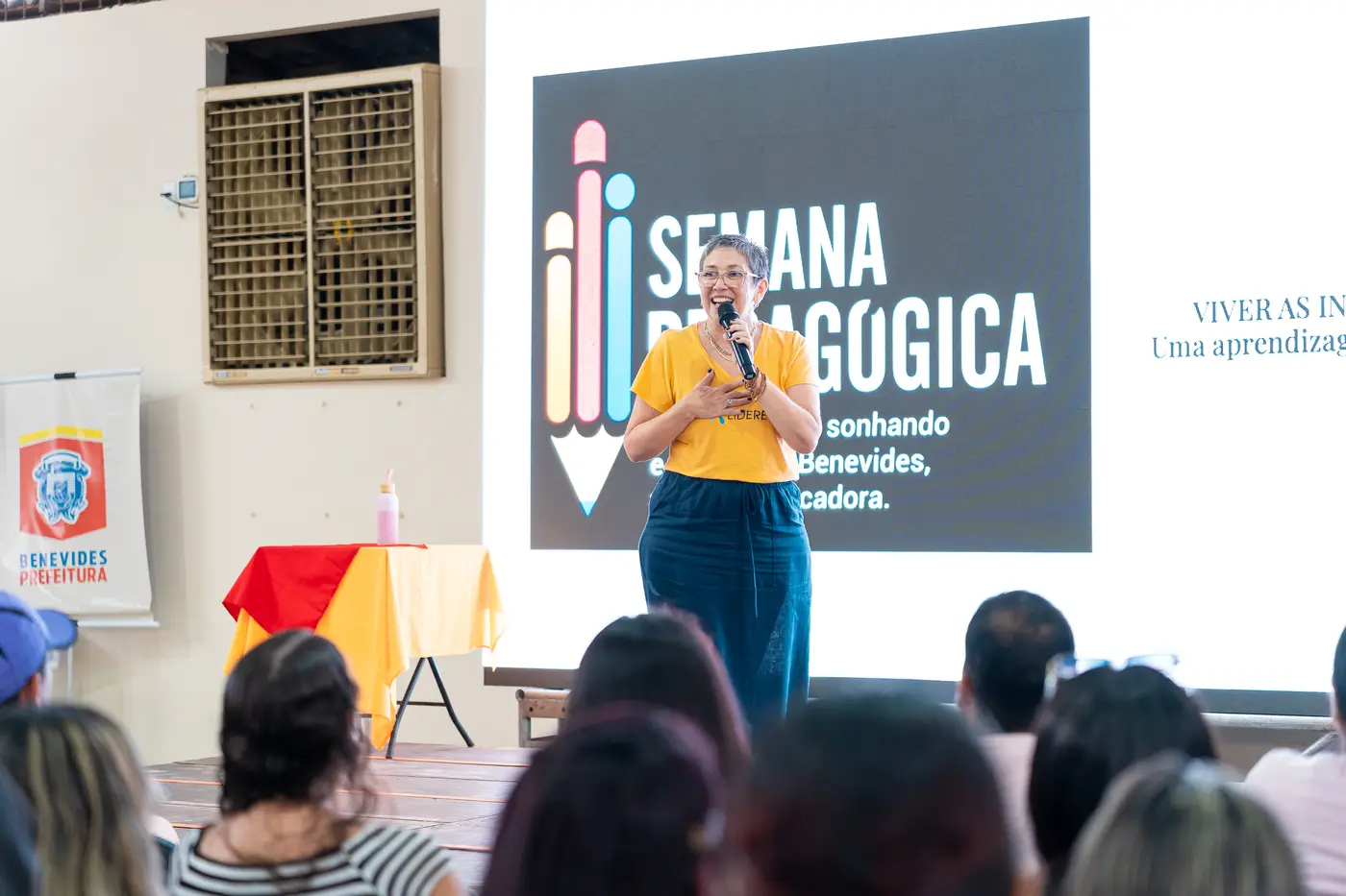 Saudando os servidores participantes da jornada, a prefeita de Benevides, Luziane Solon, mencionou o trabalho que vem sendo feito no município em todos os setores, ressaltando a importância da educação como base para o desenvolvimento. "Quero agradecer a cada um de vocês pelo acolhimento que dão aos alunos. Temos mesmo que oferecer muito amor às nossas crianças", disse.